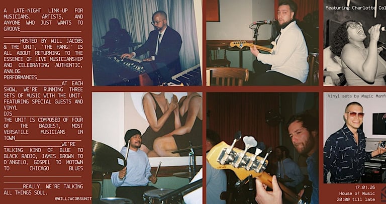 “A late-night link-up for musicians, artists, and anyone who just wants to groove. Hosted by Will Jacobs & The Unit, ‘The Hang!’ is all about returning to the essence of live musicianship and celebrating authentic, analog performances. At each show, we’re running three sets of music with The Unit, featuring special guests and vinyl DJs. The Unit is composed of four of the baddest, most versatile musicians in town. We’re talking Kind of Blue to Black Radio, James Brown to D’Angelo, Gospel to Motown to Chicago Blues – really, we’re talking all things Soul.”